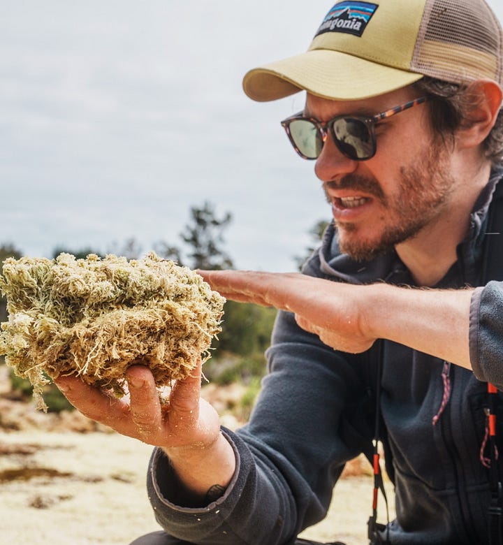 Martín me explica que este musgo es capaz de retener hasta 20 veces su peso en agua: esta propiedad ultra absorbente lo hace muy valioso para ciertas industrias, en particular la cosmética, la horticultura y el cultivo sin suelo. Sumerjo mi brazo en la densa capa vegetal y noto enseguida cómo alcanzo una zona fresca, saturada de agua.