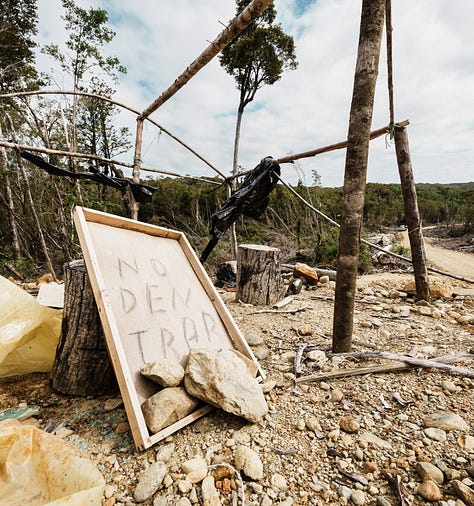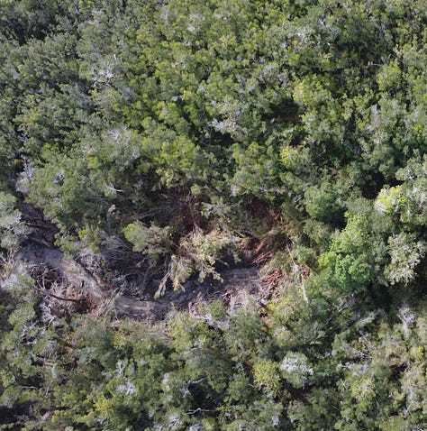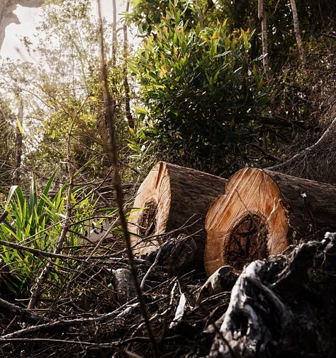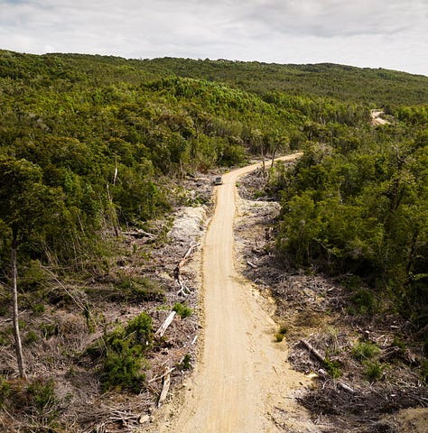 Martín nos lleva en auto hacia el interior de la isla. La carretera asfaltada pronto da paso a un camino de tierra que se adentra en el bosque. A ambos lados, durante varias decenas de metros, todos los árboles han sido talados.