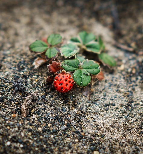 Una frutilla de Chile (Fragaria chiloensis) luce un sencillo botón reluciente sobre el manto gris de la playa. Me arrodillo para recoger el fruto y devorarlo: es tan sabroso que no me sorprende que esta especie haya sido usada en la hibridación que dio origen a la fresa de jardín moderna. Más adelante, Martín me muestra una turbera cubierta de pompón (Sphagnum magellanicum.), un tipo de musgo con propiedades absorbentes muy útiles en horticultura.