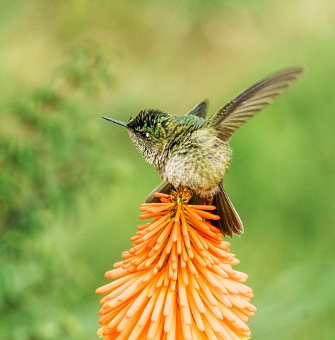 El Choroy (Enicognathus leptorhynchus), una especie de loro endémico de Chile con una hermosa franja roja sobre los ojos, se posa en grupo en la copa de los árboles. Brillantes colibríes atraen rápidamente nuestra atención: los observamos largo rato picoteando Kniphofia de vivos colores (originarias de África, por lo tanto completamente ausentes de Chiloé en la época de Darwin). Por cierto, en español esta especie se llama “picaflor chico”: ¡literalmente, “pequeño bebedor de flores”!