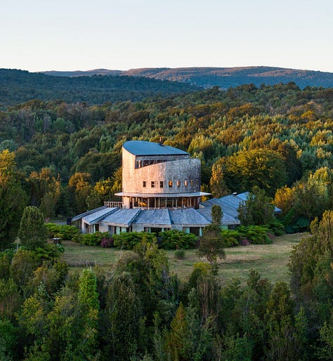 Un inmenso edificio de curvas de madera se alza en medio del bosque. Aquí nos alojaremos durante los próximos días. Ofrece una interesante vista panorámica sobre el parque: según Martín, sería posible ver al zorro merodeando por los alrededores.