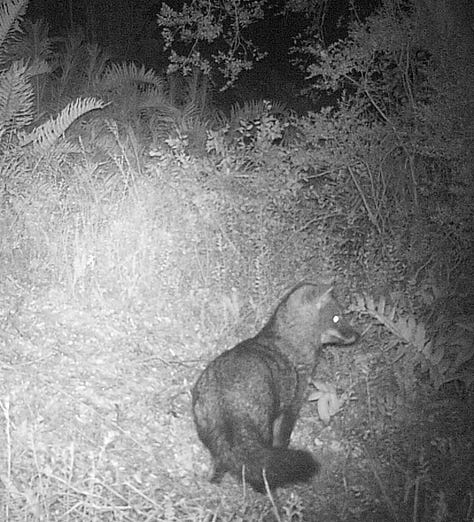 Esta vez tuvimos más suerte y, cuando revisamos las imágenes al día siguiente, lo veo, por fin: un zorro de Darwin. Naturalmente, el paso es fugaz y la filmación no es de gran calidad. Como el zorro pasó de noche, la cámara activó una lámpara infrarroja y el resultado es un video en blanco y negro.